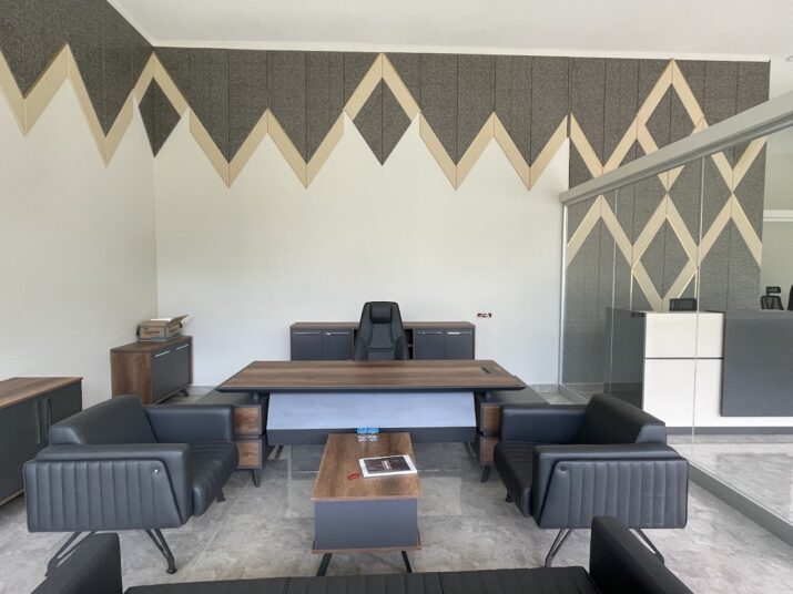 makam odası için imaj makam takımı seçildi makam koltugu olarak bala müdür koltuk ve vera kanepe takımını kombin yaparak odanın tasarımını lüks ve rahat bir hale kavuşturduk. yönetici odasında tv ve eylence bölümü için ayrılan bölüme imaj makam takımına model olarak tasarladıgımız tv ünitesini yerleştirdik. böylece hem ev konforunu ofise taşımış olduk hemde rahat bir ofis yaşama alanı yarattık. yüksek olan ofis duvarlarına özel tasarladıgımız duvar kaplamalarını antrasit renkler kullanarak deri kaplama yaptık simetri kullanılarak tasarlanan duvar kaplamalarının birkaç yerinde altın çıta kullanarak daha eylenceli bir tasarım yarattık.