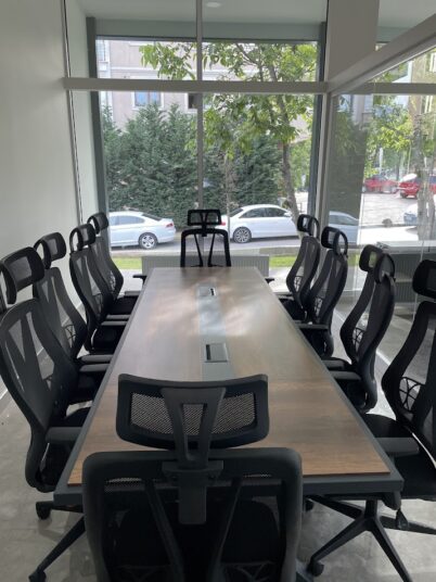 Toplantı odası için ayrılan bölümde 10 kişilik bu proje için tasarladığımız toplantı masası ve ergonomik , aynı zamanda şık görsel sunan koltuklar. Bu oda için tasarladığımız dosya dolabı duvardan duvara ölçüsünde özel üretildi