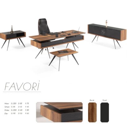 Bu takım; mali müşavirlerden yazılım ofislerine, eğitim kurumlarından sağlık merkezlerine kadar her sektöre uyum sağlar. Ofis dekorasyonu konusunda kararsız kaldıysanız, Favori’nin zamansız tasarımı her türlü duvar rengi ve aksesuarla (tablolar, masa lambaları, bitkiler) mükemmel bir sinerji oluşturur.