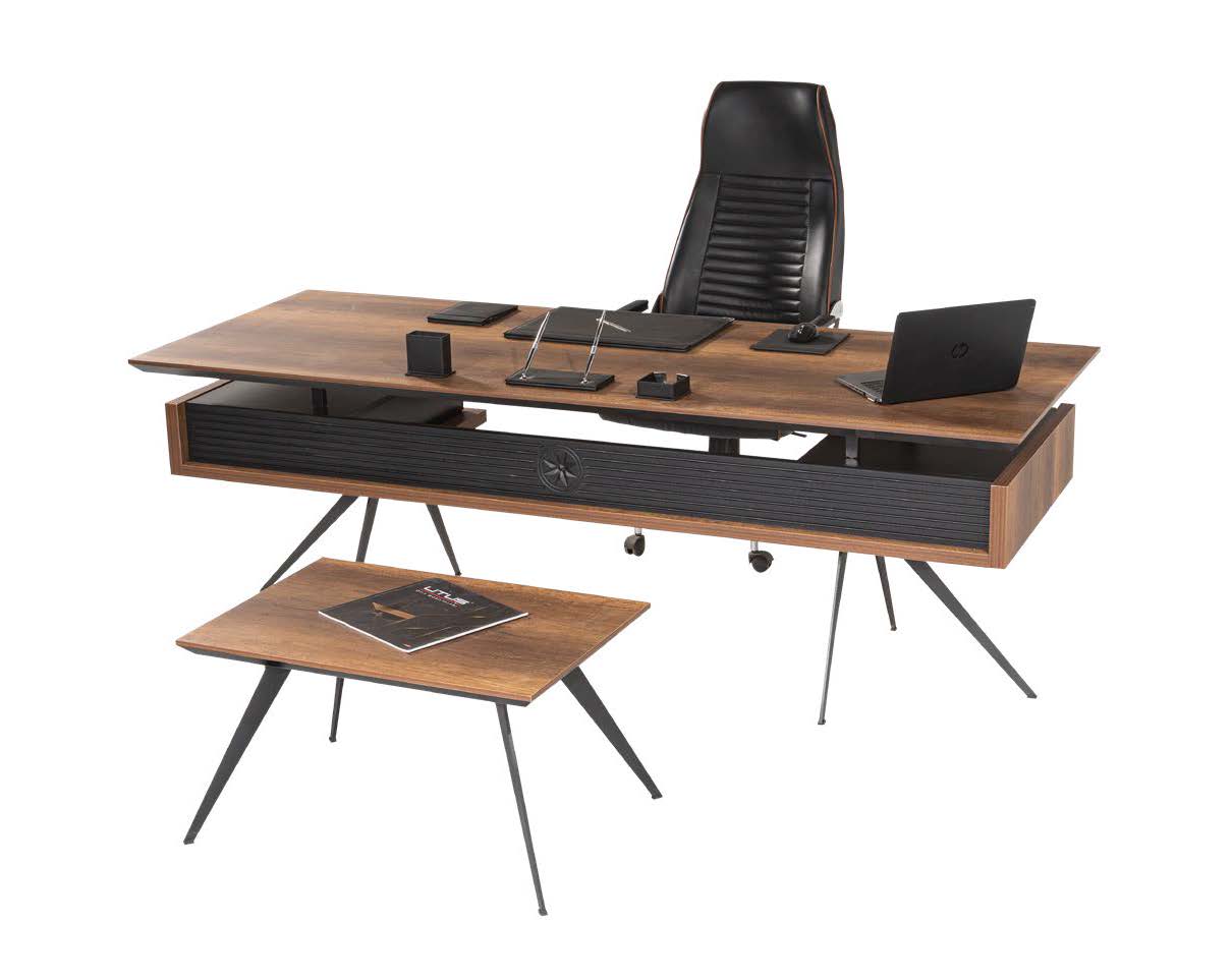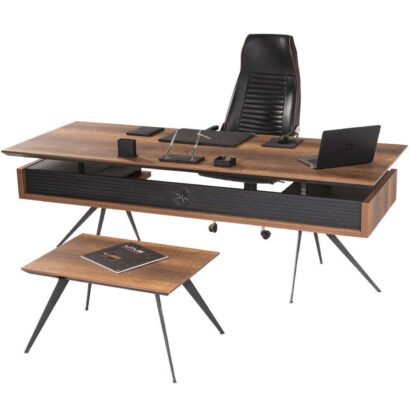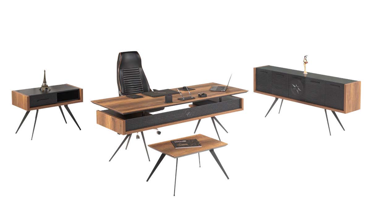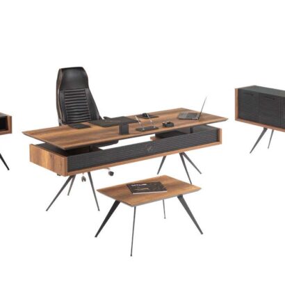 3. Estetik Kontrast: Genellikle iki farklı dokunun (örneğin antrasit ve ahşap tonları) birleşimiyle sunulan bu takım, VIP ofis mobilya şıklığını daha erişilebilir bir bütçeyle ofisinize getirir.