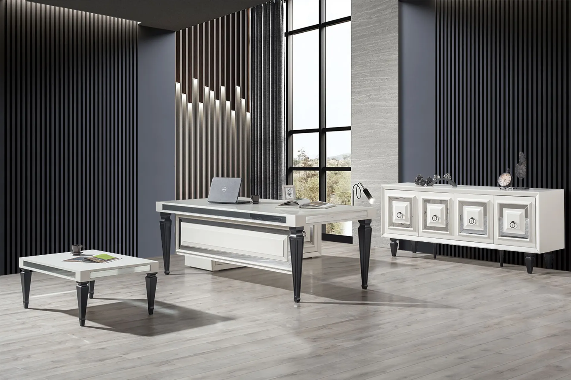 Ivonna Makam Takımı, modern ofislerin estetik anlayışına hitap eden zarif ve güçlü bir tasarıma sahiptir. Masa takımı, dayanıklılığı ve pürüzsüz yüzeyiyle bilinen MDF malzemeden üretilmiş olup, lake boya ile kaplanarak hem şıklık hem de uzun ömürlü kullanım sunar. Lake yüzeyin parlak ve kaliteli dokusu, ofisinize sofistike bir hava katarken, gürgen ağacından üretilmiş ayaklar ise sağlamlık ve doğal bir görünüm sağlar.