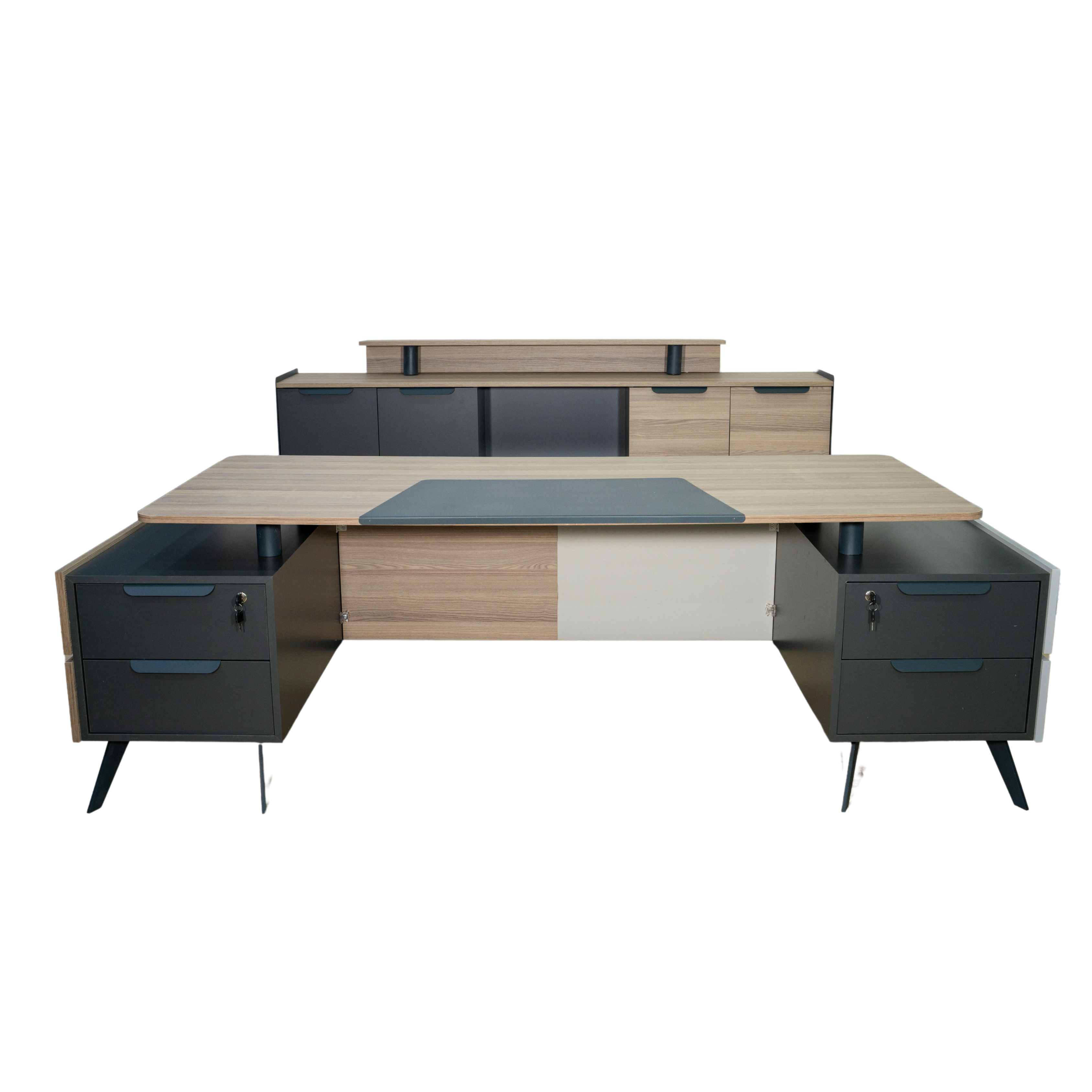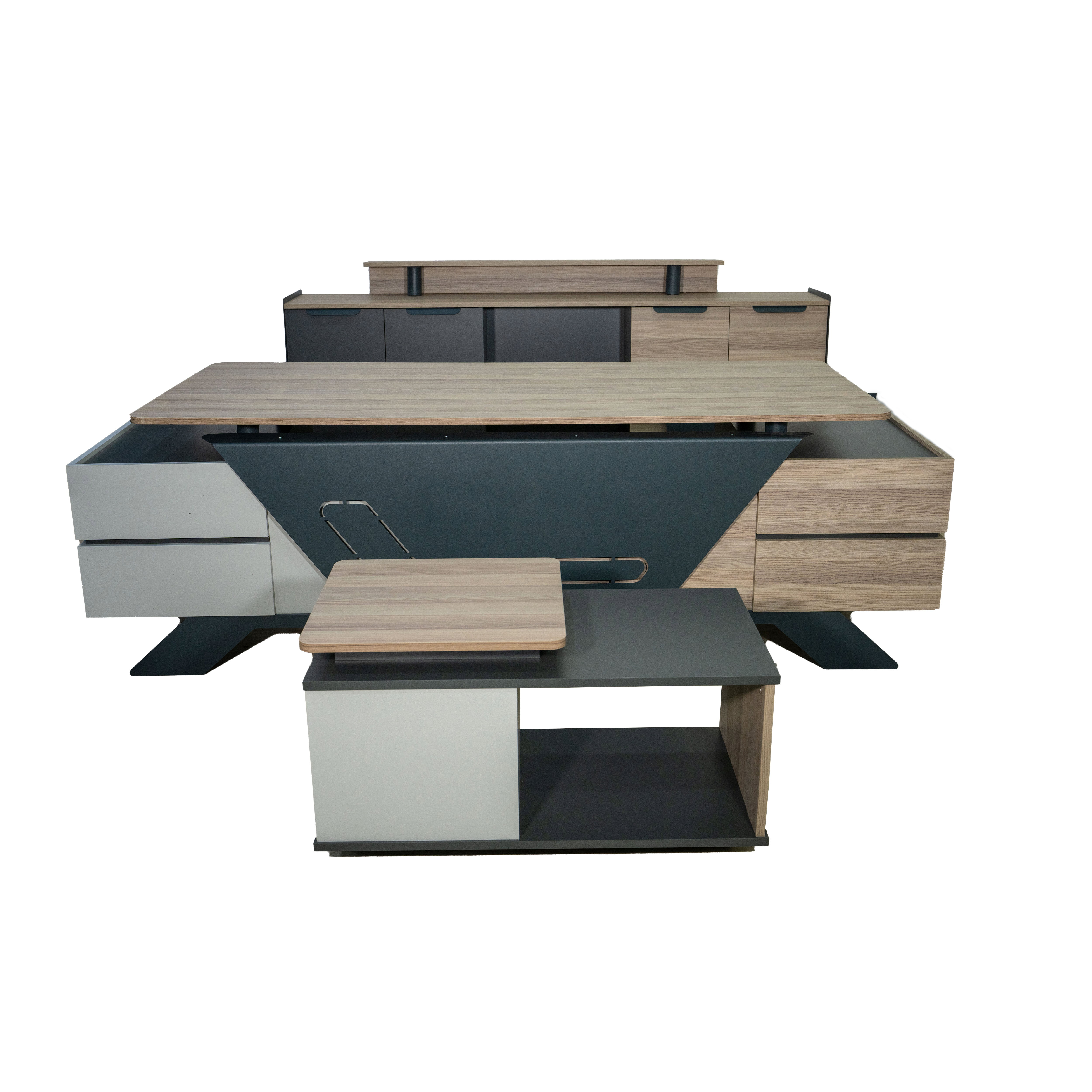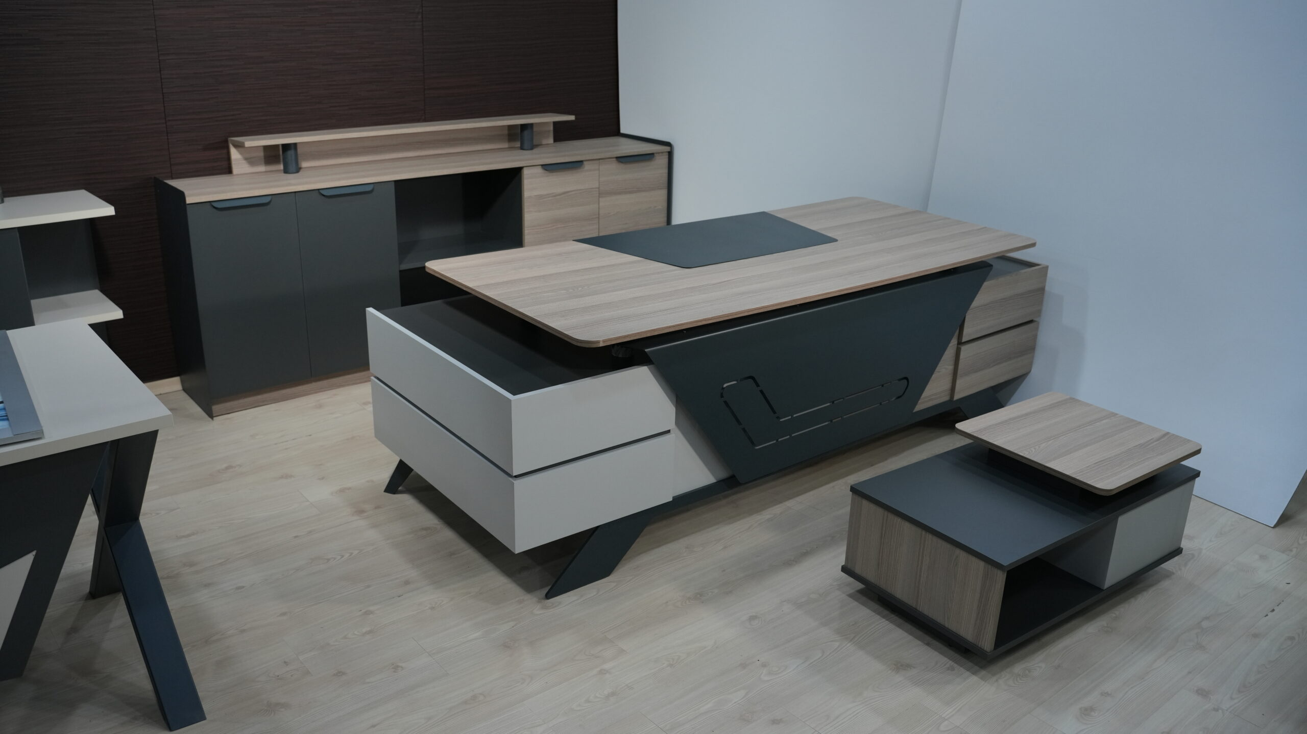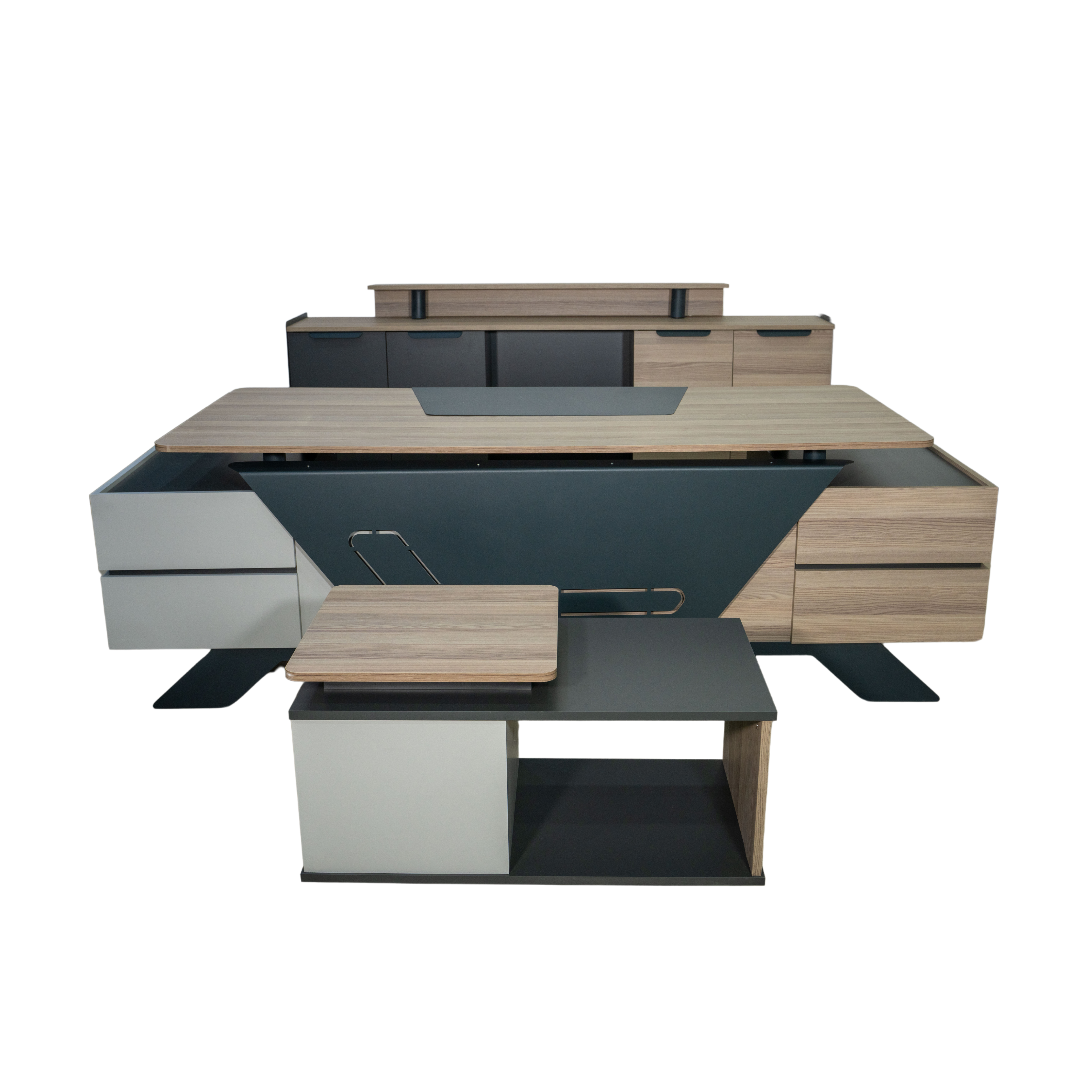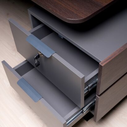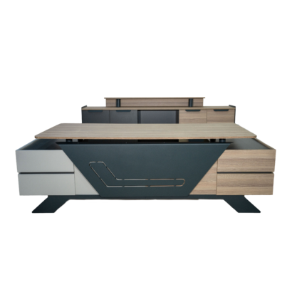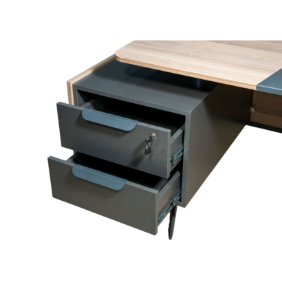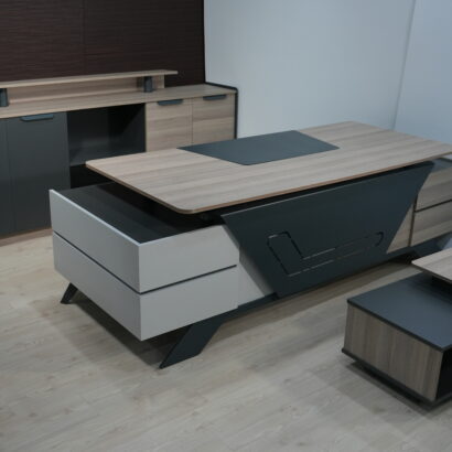 Geniş masa tablası ve çekmece modülü, kullanıcıların işlerini düzenli bir şekilde yerine getirmelerine olanak tanırken, kapaklı bölüm ve dosya alanlarıyla zengin bir kullanım sağlanmıştır. Takıma eklenen dolap ise dosyalar için geniş bir alan sunarken, şık tasarımıyla diğer rakiplerini geride bırakmayı hedeflemektedir.